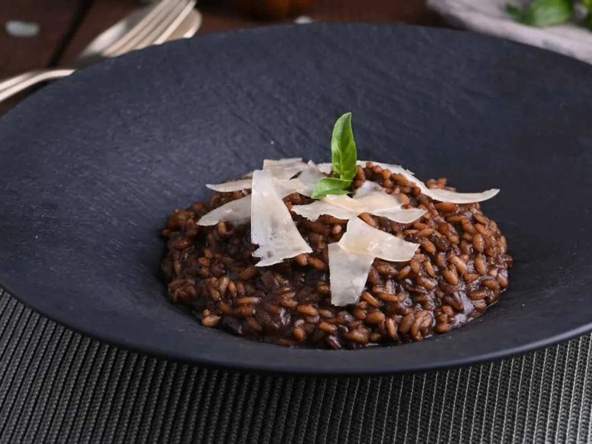 Risotto de ajo negro con lascas de queso